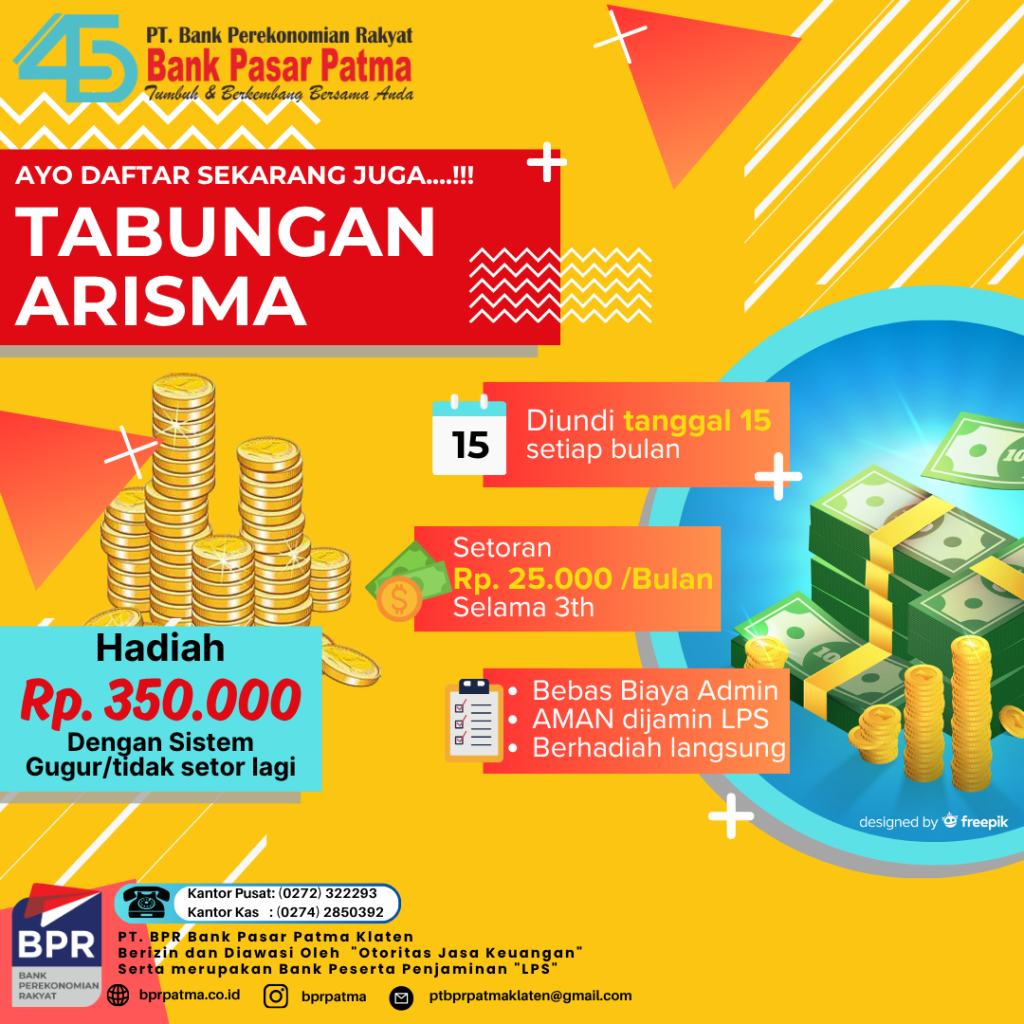Tabungan ARISMA adalah Tabungan Arisan Patma yang dipergunakan untuk perorangan. Tabungan ARISMA memiliki hadiah menarik berupa uang sebesar Rp. 350.000,- yang diundi setiap tanggal 15. Pengundian untuk satu rekening yang diundi dalam satu kelompok yang terdiri dari 300 rekening. Tabungan ARISMA menggunakan sistem gugur.